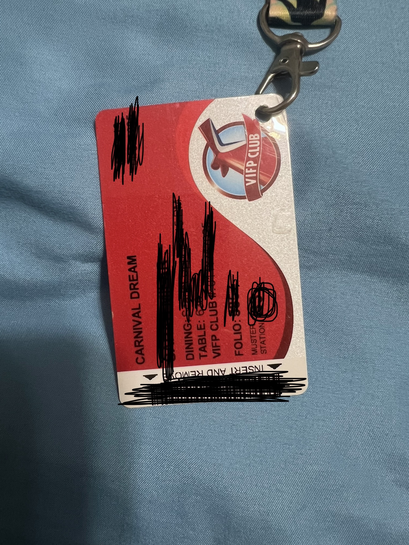 On a Carnival Cruise Ship none of the stores, bars, or restaurants that cost extra will accept cash, debit cards, credit cards, checks, or any tap payments. So, how do you pay for any purchases on the ship? Well fear not there is a way. When you board the ship you are given a card that has your name and room number on it. This card acts as your room key and as your alternate credit card for on-ship purchases. And it is charged to your room and the credit card attached to your Carnival accountYou can just put this card in your pocket or wallet. However the best and most popular way to carry it is by attaching it to a lanyard.